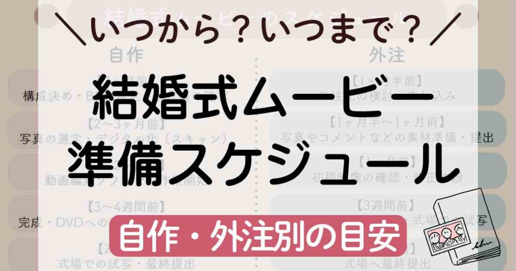 結婚式ムービーの制作準備で、「いつから作っていつまでに完成させればいいの?」「提出期限ギリギリだけど間に合う?」と不安な方も多いでしょう。 結論、完成期限は挙式2週間前までが一般的ですが、上映トラブルを避けて安全に準備するには、挙式の1ヶ月... -